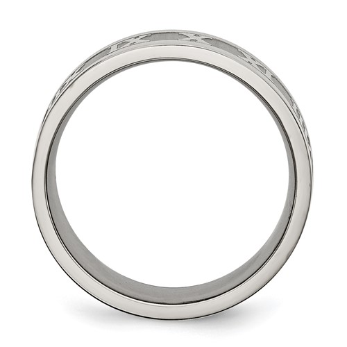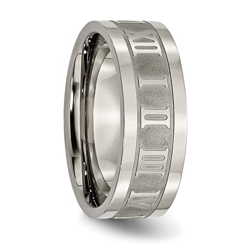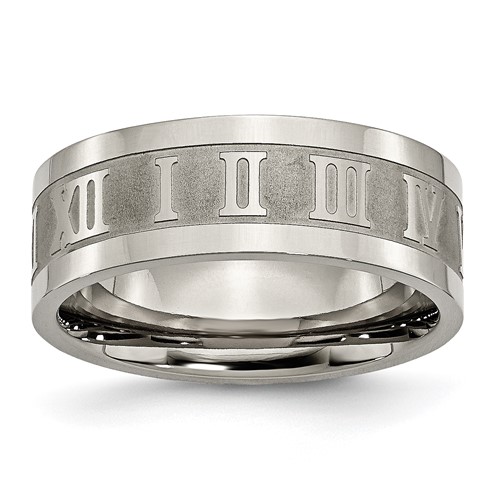 Titanium ring is decorated with roman numerals for the numbers 1 to 12 all the way around the ring. Width: 8mm. This ring has a flat brushed center and polished flat edges. Comfort fit ring is made of commercially pure titanium, grade 4 [CP 4]. Imported. This style is available in half and whole finger sizes, 7-13.
