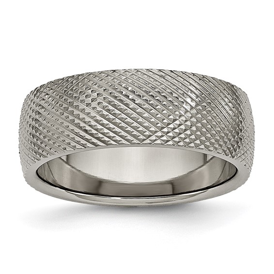 Titanium ring has a raised texture of interlocking grooves. Width: 8mm. Comfort fit ring is made of commercially pure titanium, grade 4 [CP 4]. Imported. This style is available in half and whole finger sizes, 7-13.