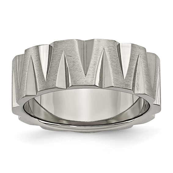Brushed finish titanium ring features V-shaped, polished notches. This style is available in half and whole finger sizes, 7-13. Comfort fit ring is made of commercially pure titanium, grade 4 [CP 4]. Imported.