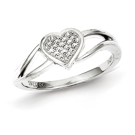 A cluster of round brilliant genuine diamonds tops this heart shaped promise ring. Solid, polished sterling silver. Diamond ct total weight: .05, I2 clarity, H-I color. Available in whole sizes only, 6-8. Approximate item weight: 4.0 grams. Imported.