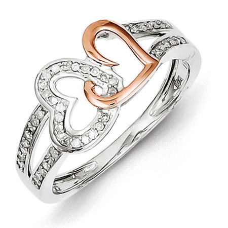 Promise ring features one 14k rose gold plated heart and one diamond accented heart. Ring is made of solid, polished sterling silver. Diamond ct total weight: .15, I2 clarity, H-I color. Available in whole sizes 7 only while supplies last. Imported.