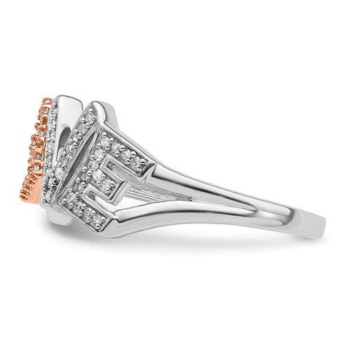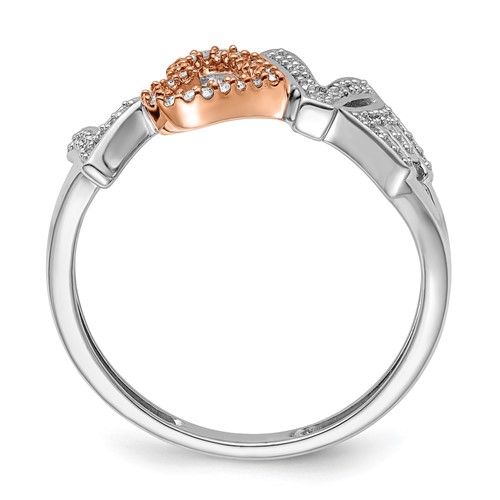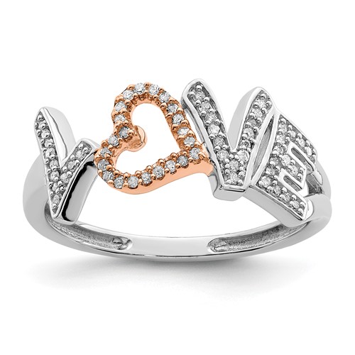 LOVE promise ring is made of 14kt rose gold and sterling silver. Diamond ct total weight: .15, I2 clarity, H-I color. Available in whole sizes only, 6-8. Imported.