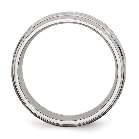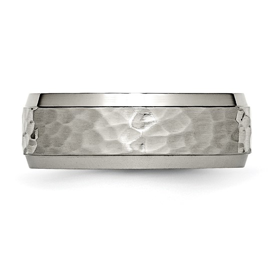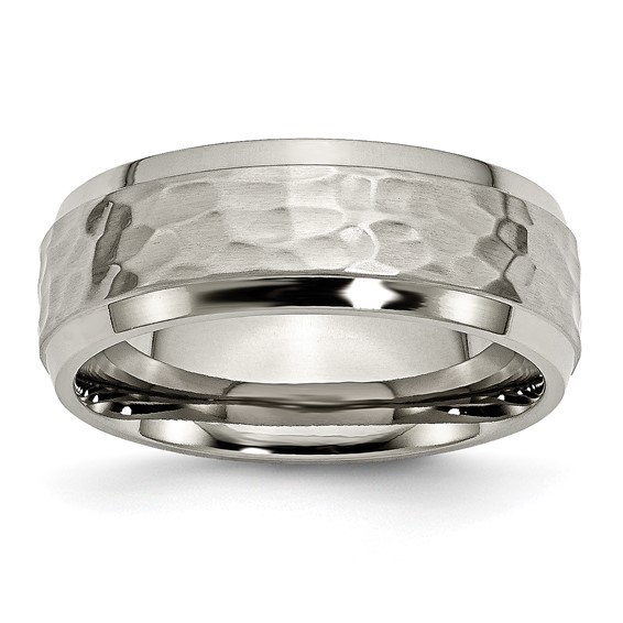 This hammered titanium ring has polished beveled edges. Comfort fit ring is 8mm wide. Made of commercially pure [CP] titanium. Approximate weight: 5.2 grams. Available in 7-15, whole and half finger sizes only.