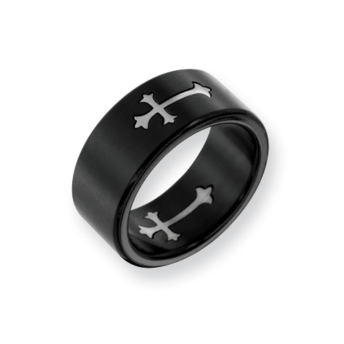 This black ion-plated titanium ring has a brushed finish. The crosses are polished. Comfort fit ring is 9mm wide. Made of commercially pure [CP] titanium. Approximate weight: 4.6 grams. Imported.