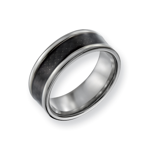 Titanium ring boasts a black carbon fiber inlay and rounded edges. Width: 8mm. Made of commercially pure [CP] titanium. Approximate weight: 3.7 grams. Available in 7-13, whole and half finger sizes only. Imported.