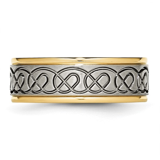 14kt yellow gold plated titanium ring has a brushed finish. Flat center and beveled edges. Comfort fit ring is 8mm wide. Made of commercially pure [CP] titanium. Available in 6-13, whole and half finger sizes only. Approximate weight: 2.5 grams. Imported.