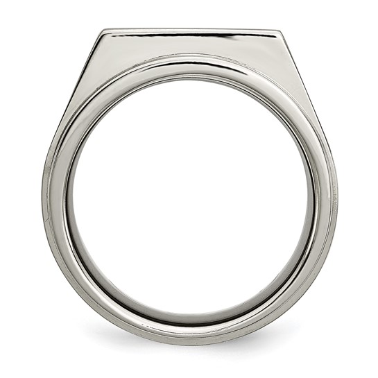 Titanium ring features a rectangular top with a diamond accent. Comfort fit ring has a satin finish on top, with polished edges. 1/20 CT diamond accents, I1 clarity and G-I color. Available in whole and half finger sizes only, 7-13. Made of commercially pure [CP] titanium. Imported.