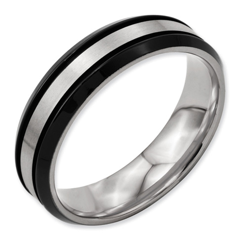 Handsome titanium ring has a flat satin center and black plated beveled edges. Width: 6mm. Available in whole and half finger sizes only, 6-13. Comfort fit. Made of commercially pure [CP] titanium. Imported.