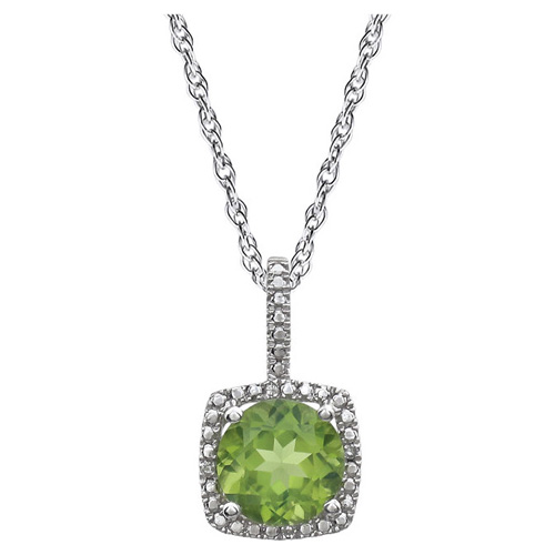 Halo style peridot and diamond necklace. 6mm round genuine green peridot gemstone and .015 ct tw diamond accents. Polished sterling silver 18in loose rope chain with lobster clasp.