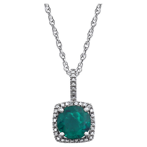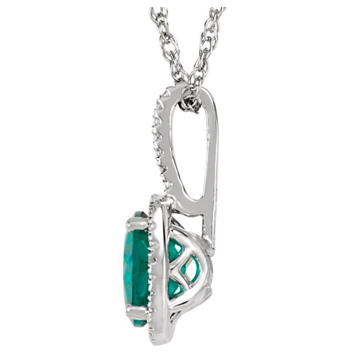 Halo style created emerald and diamond necklace. One 7mm round created emerald gemstones and .015 ct tw diamond accents. Polished sterling silver 18in loose rope chain with lobster clasp. Pair with matching earrings JJ650167EM and ring JJ69940EM.