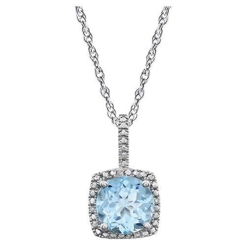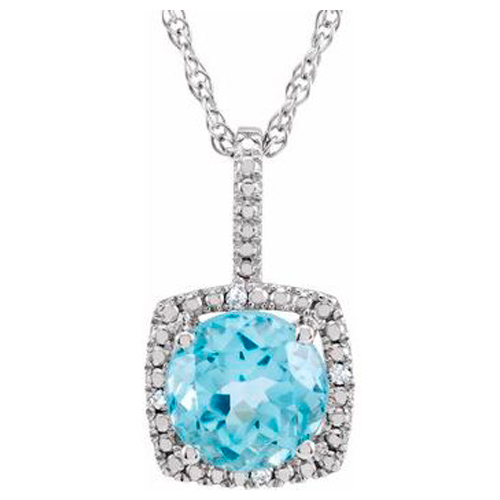 Halo style sky blue topaz and diamond necklace. One 7mm round genuine sky blue topaz gemstone and .015 ct tw diamond accents. Polished sterling silver 18in loose rope chain with lobster clasp. Pair with matching earrings JJ650167BT and ring JJ69940BT.