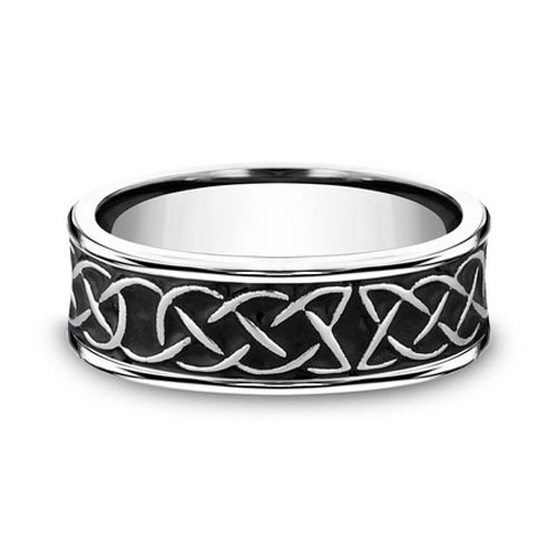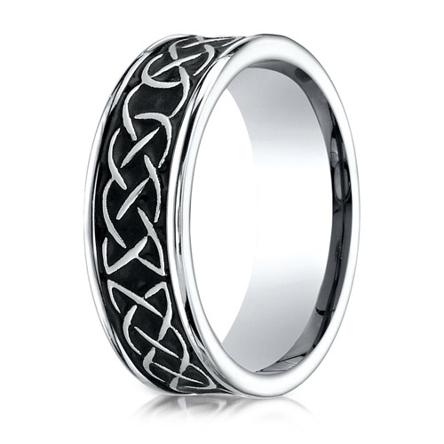 This cobalt chrome ring features a blackened Celtic knot finish. Comfort fit. Width: 7mm. Thickness: 2.0mm.About Cobalt ChromeCobalt Chrome is a unique alloy blend that consists of cobalt and other substances to form a bright white alternative metal. It is as white as platinum, hypoallergenic, unbreakable, and scratch resistant. These bands are light-weight, inside round comfort fit and very comfortable to wear. This metal has been used in medical applications for years. Occasional polishing may be required.Manufacturer's Lifetime GuaranteeIf your ring is ever damaged during normal wear, the manufacturer will repair or replace your wedding ring free of charge. If your finger size ever changes, the manufacturer will resize or replace your ring free of charge. In the case that the manufacturer has to add material to your ring, you will only be charged for the difference in the additional metal or stones needed to restore the piece. Guarantee ParametersThe guarantee does not cover rings that have been ordered in the wrong finger size or finger sizes that may have changed between the time of purchase and the actual physical receipt of the piece. Third party alterations, other than engraving, will void the warranty.Manufacturer reserves the right to deny the Lifetime Guarantee for any ring that shows signs of abuse or tampering.