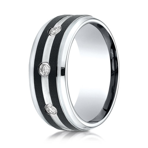 This cobalt chrome ring features three white round ideal cut diamonds and double graphite inlay. Diamond total carat weight: .20 ct. Comfort fit. Width: 9mm. Thickness: 2.0mm. Made in USA. About Cobalt ChromeCobalt Chrome is a unique alloy blend that consists of cobalt and other substances to form a bright white alternative metal. It is as white as platinum, hypoallergenic, unbreakable, and scratch resistant. These bands are light-weight, inside round comfort fit and very comfortable to wear. This metal has been used in medical applications for years. Occasional polishing may be required.