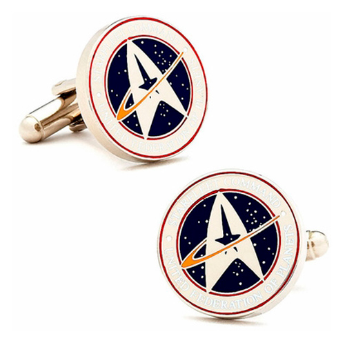 Round Star Trek cufflinks depict the logo for Starfleet Command. Approximately 3/4in x 3/4in [size of a penny]. Enamel and rhodium plated. Bullet back closure. STAR TREK and related marks are trademarks of CBS Studios Inc. All Rights Reserved.