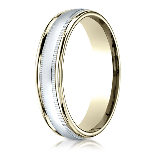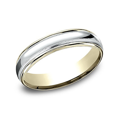 This wedding band has a milgrain platinum center and polished 18k yellow gold edges. Die struck and comfort fit. Width: 4mm. Made in USA.