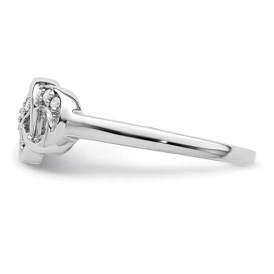 Polished sterling silver infinity heart ring is decorated with .05 ct tw diamond accents. Available in whole finger sizes only, 6-8. Approximate weight: 1.75 grams. Imported.