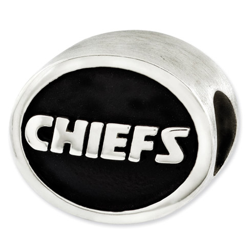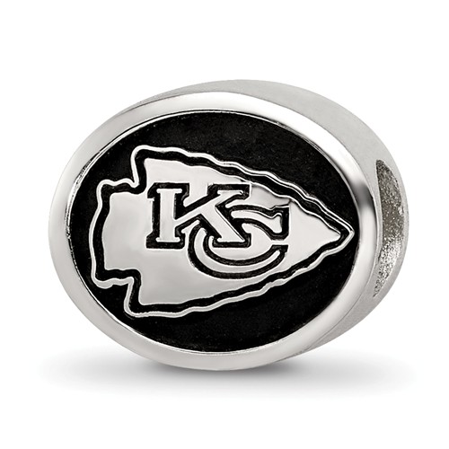 Kansas City Chiefs bead is made of antiqued, solid sterling silver. Two-sided design, bead hole diameter is 4mm. Made in the USA. Officially licensed NFL product. This bead is compatible with all major personalized bead bracelet systems.