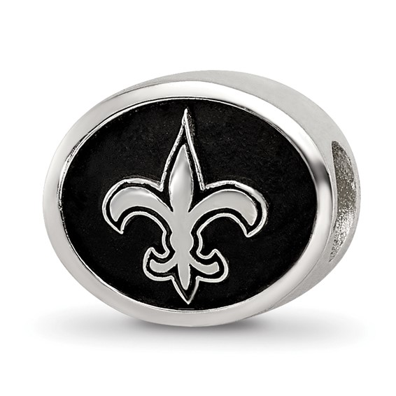 New Orleans Saints bead is made of antiqued, solid sterling silver. Two-sided design, bead hole diameter is 4mm. Made in the USA. Officially licensed NFL product. This bead is compatible with all major personalized bead bracelet systems.