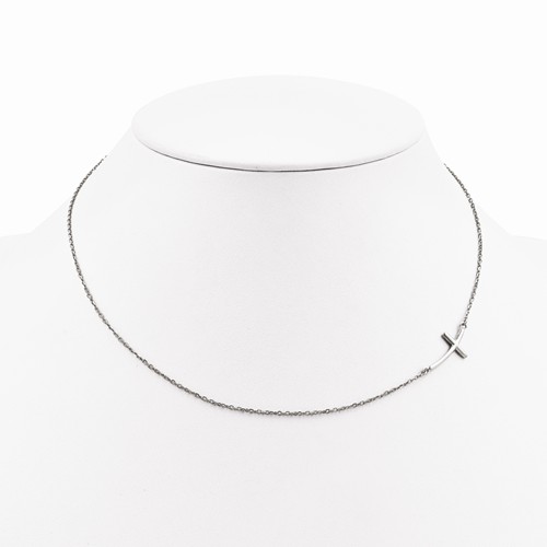 Polished, solid 14kt white gold sideways cross is curved to fit your neck line. Cross dimensions: 3/4in x 1/4in. Necklace length: 19in. Made in the USA. Lobster clasp. Approximate weight: 3.3 grams.