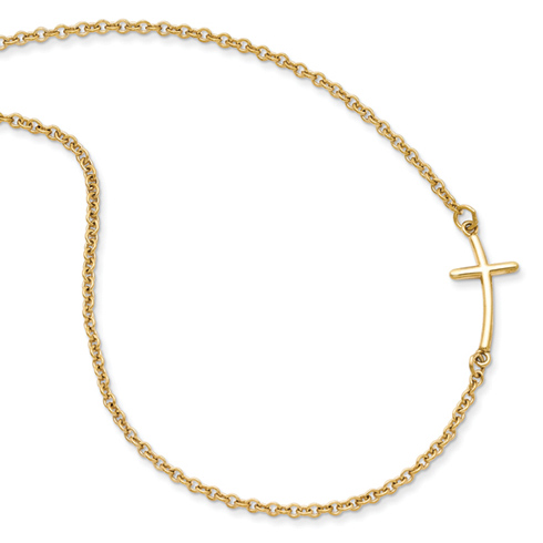 This gold-plated sterling silver sideways cross is curved to fit your neck line. Polished finish. Cross dimensions: 5/8in x 3/8in. Necklace length: 18in. Made in the USA. Lobster clasp. Approximate weight: 4.2 grams.