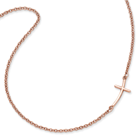 This rose gold-plated sterling silver sideways cross is curved to fit your neck line. Polished finish. Cross dimensions: 5/8in x 3/8in. Necklace length: 18in. Made in the USA. Lobster clasp. Approximate weight: 4.2 grams.