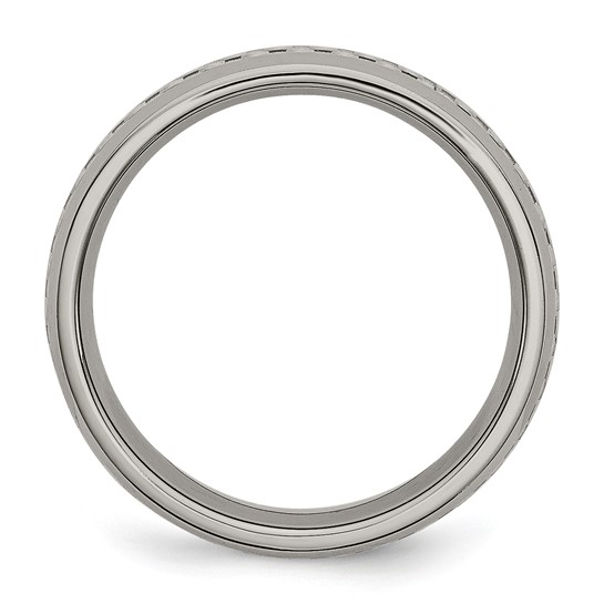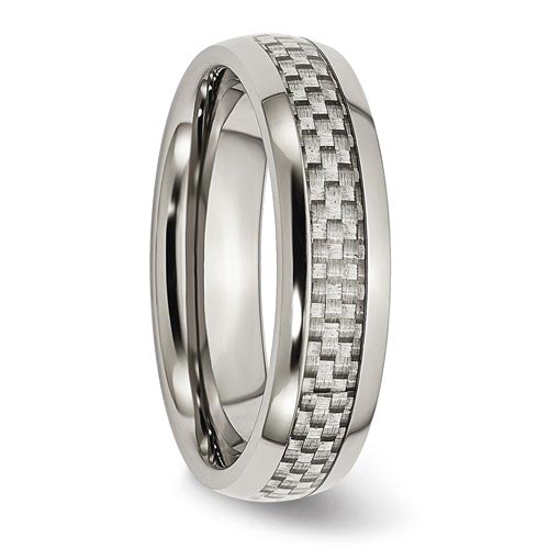 Polished titanium ring boasts a gray carbon fiber inlay. Width: 6mm. This style is available in half and whole finger sizes, 6-13. Comfort fit ring is made of commercially pure titanium, grade 4 [CP 4]. Imported.
