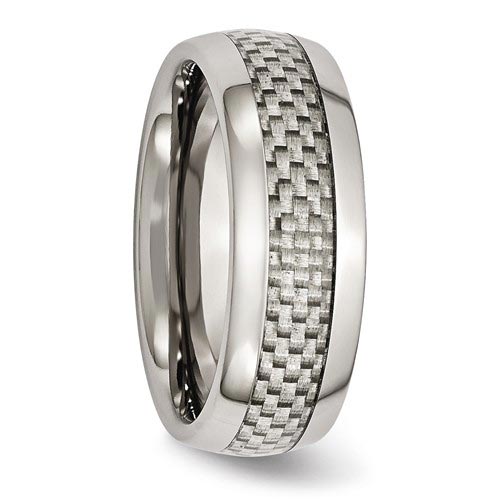 Polished titanium ring boasts a gray carbon fiber inlay. Width: 8mm. This style is available in half and whole finger sizes, 6-15. Comfort fit ring is made of commercially pure titanium, grade 4 [CP 4]. Imported.