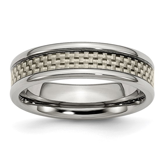 Polished titanium ring boasts a gray carbon fiber inlay and rounded edges. Width: 6mm. This style is available in half and whole finger sizes, 7-13. Comfort fit ring is made of commercially pure titanium, grade 4 [CP 4]. Imported.