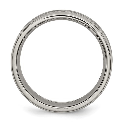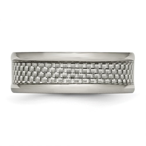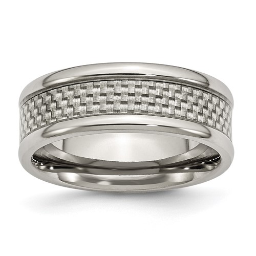 Polished titanium ring boasts a gray carbon fiber inlay and rounded edges. Width: 8mm. This style is available in half and whole finger sizes, 7-13. Comfort fit ring is made of commercially pure titanium, grade 4 [CP 4]. Imported.
