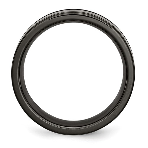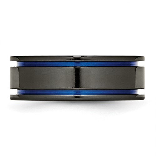 Black titanium thin blue line ring has a polished finish. Anodized grooves. Width: 8mm. Made of black Ti™. Enjoy our limited lifetime warranty. This style is available in half and whole finger sizes, 7-13.About Black Ti™Each ring in the Black Ti™ collection possesses the same benefit as gray titanium. Black Ti™ is the only non-coated, completely nickel-free and inert titanium alloy that can be processed to black. Black Ti™ was created through extensive research and development in blending titanium with other strategic elements.Black Ti™ is a proprietary alloy which miraculously experiences an atomic transformation at the molecular level to become ceramic, turning the titanium black from the outside in by exposing the element to extreme heat. The severe hardness created through this unique process yields a supremely scratch resistant surface.