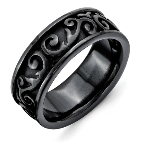Black titanium, comfort fit ring has etched scroll design. Brushed and polished with concave center. Width: 8.5mm. Made of black Ti™. Enjoy our limited lifetime warranty. This style is available in half and whole finger sizes, 7-13.About Black Ti™Each ring in the Black Ti™ collection possesses the same benefit as gray titanium. Black Ti™ is the only non-coated, completely nickel-free and inert titanium alloy that can be processed to black. Black Ti™ was created through extensive research and development in blending titanium with other strategic elements.Black Ti™ is a proprietary alloy which miraculously experiences an atomic transformation at the molecular level to become ceramic, turning the titanium black from the outside in by exposing the element to extreme heat. The severe hardness created through this unique process yields a supremely scratch resistant surface.