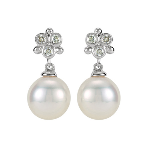 14k white gold freshwater cultured pearl earrings features .08 ct tw diamond accents. Pearl details: 2 x 7.00 MM, Very light cream to pinkish-white to white; minor blemishes; very good luster freshwater cultured pearl. 6 x 1.60 MM, H-I/I1 round diamond accents.