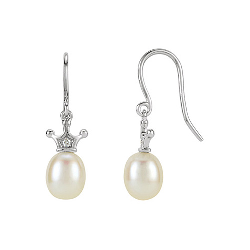 Freshwater cultured pearl crown earrings features .08 ct tw diamond accents. 14kt white gold. Pearl details: 2 x 6MM, Very light cream to pinkish-white to white; minor blemishes; very good luster freshwater cultured pearl. 2 x 1.20 MM, H-I/I1 round diamond accents.