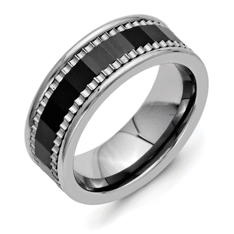 Polished titanium ring has a faceted black ceramic center and sawtooth accents. Width: 8mm. Comfort fit ring is made of commercially pure titanium, grade 4 [CP 4]. Imported. Approximate weight: 6.4 grams.