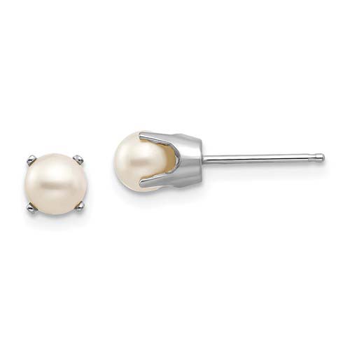 This pair of genuine near round freshwater cultured pearl stud earrings is set in 14kt white gold. Each near round pearl is 5mm in diameter. Posts with push on / pull off backs Imported. Pearl is the birthstone for the month of June.