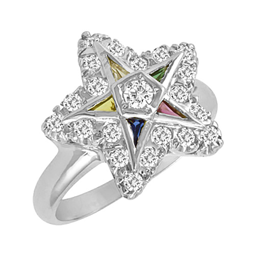 Open back, polished sterling silver Eastern Star ring is adorned with genuine diamonds. 21 round brilliant diamonds weigh: .47 ct tw. Item weighs approximately 5.2 grams. This item is handcrafted in the USA.