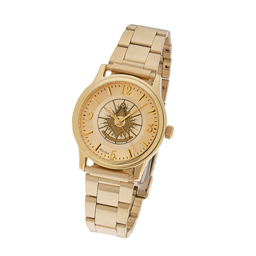 Past master Bulova watch has a gold-toned case and bracelet. Stainless steel gold colored bezel with hour, minute and sweep second hands. 38mm case. Fine quartz movement, gold colored round face. Stainless steel gold colored fold over clasp bracelet. Limited 1 year warranty.