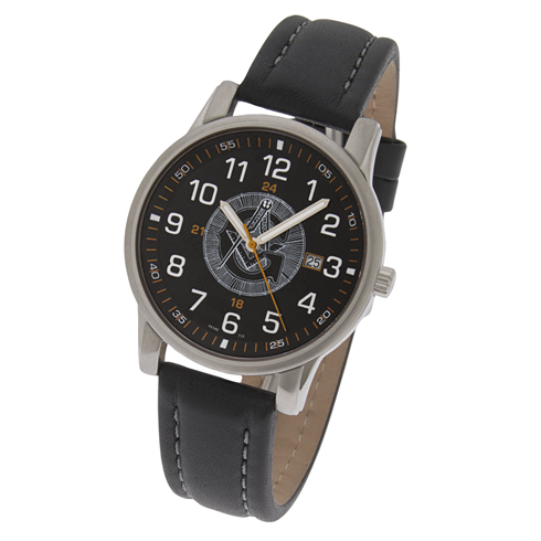 Large masonic watch has a 42mm solid stainless steel case. Black color luminous numerals arabic printed numbers dial. Index style luminous filled hands. Analog quartz movement. Date calendar. Sapphire crystal. Stainless steel case back. Genuine black leather strap. Deployment clasp. 100 meters water resistance. Three years limited factory warranty. Made in USA of Swiss parts.