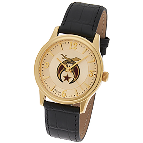 Bulova masonic shriner watch has a stainless steel gold colored bezel with hour, minute and sweep second hands. Shriner's emblem in center. Genuine black leather strap. Fine quartz movement, gold colored round face. Limited 1 year warranty.