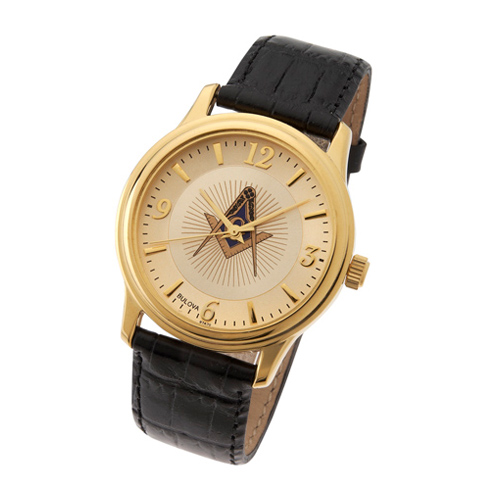 Masonic Bulova gold-tone watch has a black leather strap. Stainless steel gold colored bezel with hour, minute and sweep second hands. Fine quartz movement, gold colored round face. G, square and compasses emblem in center. 38mm case. Battery operated. Limited 1 year warranty.