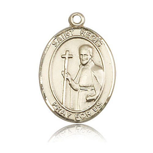 Die struck, hand-engraved St Regis medal is made of polished, solid 14k yellow gold. Inscription: SAINT REGIS PRAY FOR US. Dimensions: 1in x 3/4in. This item is the size of a quarter. Made in USA.