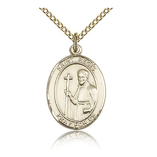 Die struck, hand-engraved medal. Inscription: SAINT REGIS PRAY FOR US. Free 18-inch sterling silver lite curb chain with lobster clasp. Dimensions: 3/4in x 1/2in. This item is the size of a penny. Made in USA.