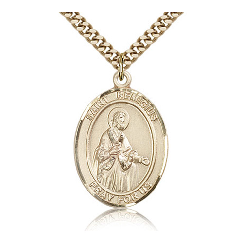 Gold filled sterling silver oval St Remigius medal dangles from a 24-inch stainless steel, endless heavy curb chain with gold plating. Die struck, hand-engraved. Inscription: SAINT REMIGIUS PRAY FOR US. Dimensions: 1in x 3/4in. This item is the size of a quarter. Made in USA.