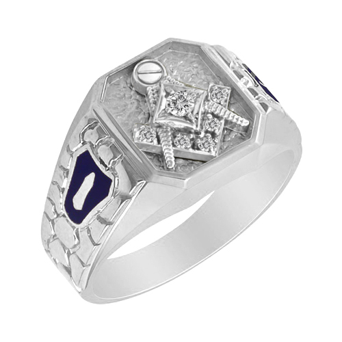 Sterling silver masonic ring has an octagonal signet top features a compass and set square symbol festooned with diamond accents. Mosaic patterned shank features blue enamel plumb bob and trowel side emblems. Open back. Diamond accents .10 ct tw. Item weighs approximately 7 grams. This item is handcrafted in the USA.