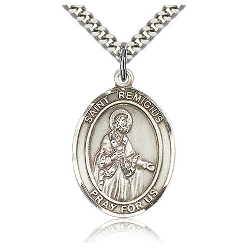 This men's St Remigius of Remis medal is made of solid sterling silver. Inscription: SAINT REMIGIUS PRAY FOR US. 24-inch stainless steel, endless heavy curb chain with silver plating. Dimensions: 1in x 3/4in. This item is the size of a quarter. Die struck, hand-engraved medal. Made in USA.