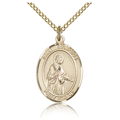 This gold-filled oval St Remigius medal dangles from a gold-plated sterling silver 18in lite curb chain with lobster clasp. 3/4in x 1/2in. This item is the size of a penny. Die struck, hand-engraved medal. Inscription: SAINT REMIGIUS PRAY FOR US. Made in USA.