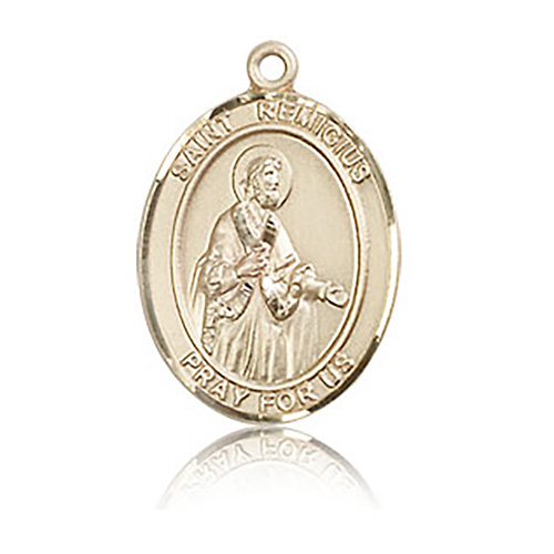 This ladies' 14k yellow gold oval St Remigius medal is die struck and hand-engraved. Inscription: SAINT REMIGIUS PRAY FOR US. Dimensions: 3/4in x 1/2in. This item is the size of a penny. Made in USA.