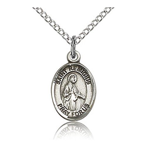 Die struck, hand-engraved St Remigius of Remis charm. Free 18-inch sterling silver lite curb chain with lobster clasp. Plain back. Dimensions: 1/2in x 1/4in. This item is half the size of a quarter. Made in USA.