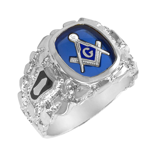 Open back, polished solid sterling silver masonic ring has a wide textured shank. Oblong blue synthetic stone is topped with a compass and set square symbol. Stone size: 12mm x 10mm. Textured shank features blue enamel plumb bob and trowel side emblems. Ring top dimensions: 13.3mm x 11.9mm. Item weighs approximately 9.1 grams. This item is handcrafted in the USA.