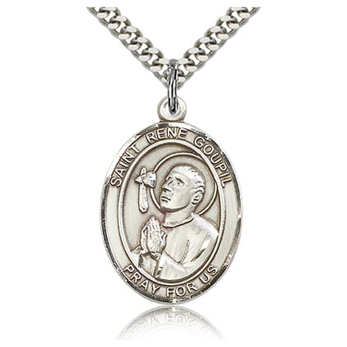 Die struck, hand-engraved medal. Inscription: SAINT RENE GOUPIL PRAY FOR US. Free 24-inch stainless steel, endless heavy curb chain with silver plating. Dimensions: 1in x 3/4in. This item is the size of a quarter. Made in USA.